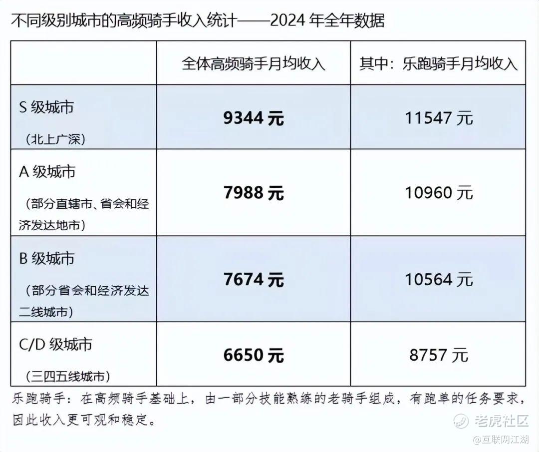 在收入方面,2024年,美团全国范围内高频骑手的月均收入在6650元至9344元之间。其中,乐跑骑手的月收入均值最高,在北上广深等高线城市可达11547元。