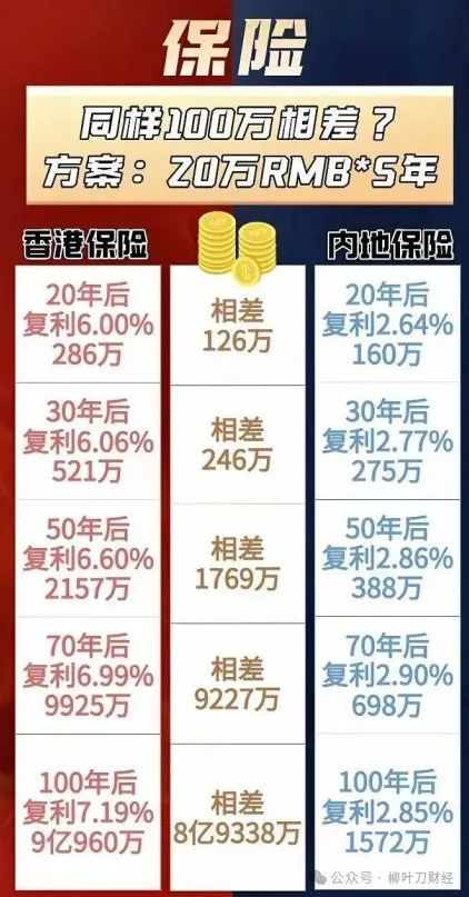 内地储蓄型保险比如增额终身寿的收益率2.5%左右,香港7%左右。看这张图,内地收益率抬高一点按2.64%算,港险压低一点按6%算,同样100万保费,20年后,内地账户价值160万,港险286万。如果是70年之后,内地账户只有698万,港险是9925万,差出去快一个小目标了。