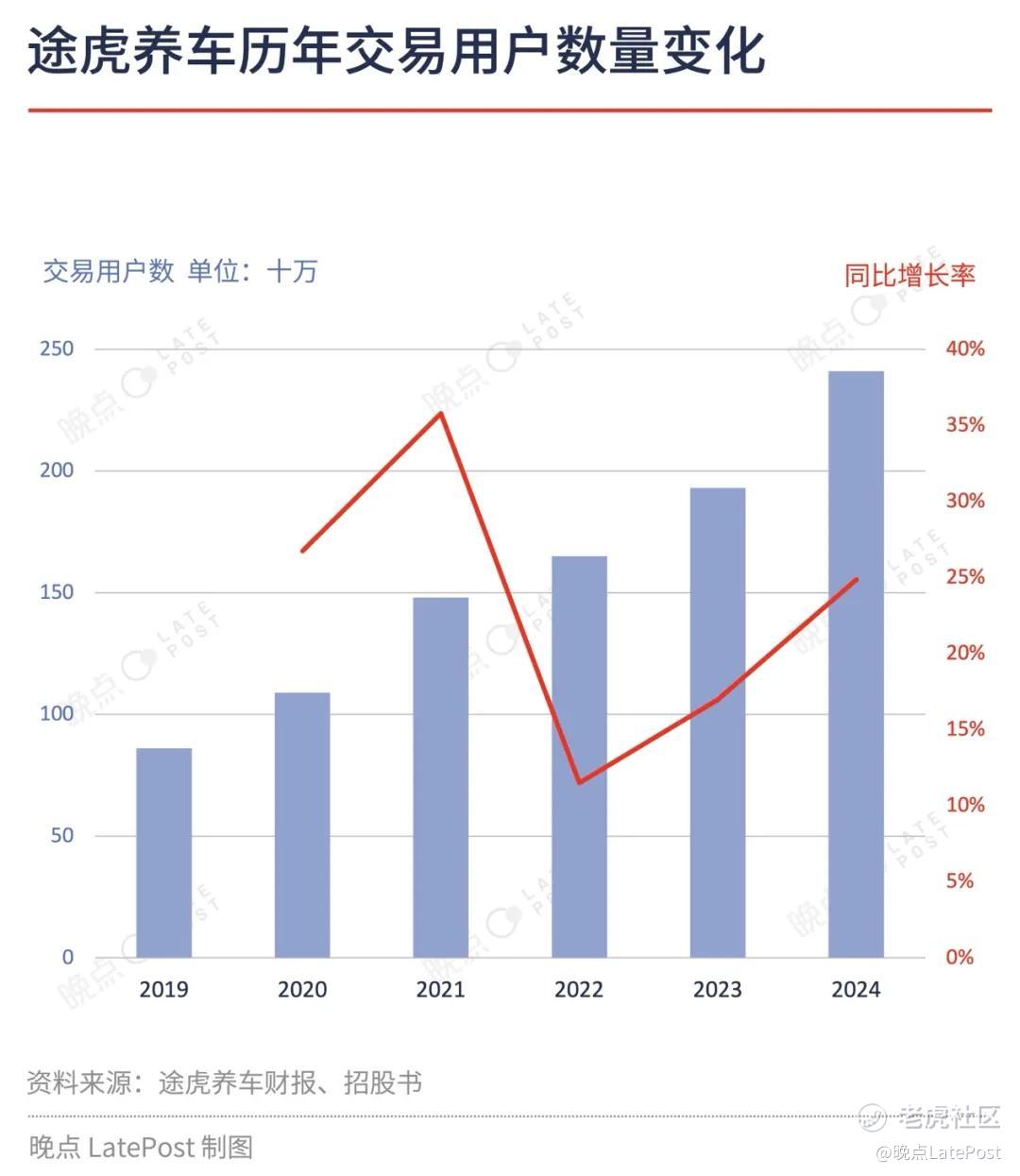 整个链条完整之后,在垂直领域,途虎拼流量的效率更高。截至 2024 年末,途虎养车累计注册用户近 1.4 亿,交易用户数达 2410 万,同比增速分别为 20.4% 和 24.8%;用户复购率提升至 62.3%。