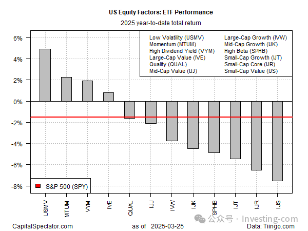 2025年以来,美国股市整体表现欠佳,但低波动股票风险溢价却大幅跑赢大市。截至3月25日收市,一组低波动ETF的表现远远优于市场整体的轻微跌幅。