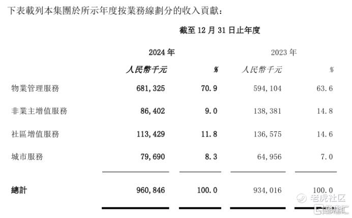 从四大业务板块情况来看,2024年,公司物业管理服务收入约为6.81亿元,占总收入70.9%,同比增长14.7%;非业主增值服务收入为8640.2万元,占总收入9%;社区增值服务收入1.13亿元,占总收入11.8%;城市服务收入占比7969.0万,占总收入8.3%,同比增长22.7%。