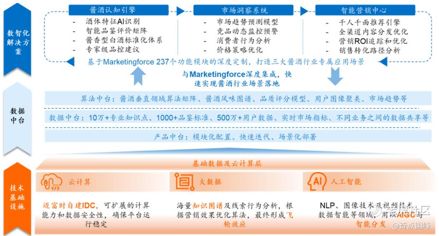 从场景应用角度,奇点国峰的酱酒大模型将构建完整的产业链数智化解决方案,在营销端完整承接 Marketingforce 六大核心场景能力:智能营销决策系统帮助企业制定精准的市场策略;销售管理平台实现经销商网络的数字化运营;社群运营机器人提供智能化私域服务;数字化会员系统打造个性化权益体系;智能客服实现全天候专业咨询支持;营销数据分析平台提供市场洞察与决策支持。
