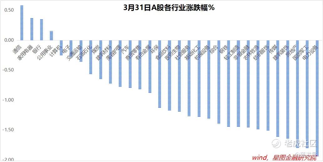 行业层面,通信(0.58%)、家用电器(0.37%)、银行、公用事业逆势收涨;电力设备(-1.94%)、国防军工(-1.81%)、房地产、建筑装饰、传媒均跌超1.6%。