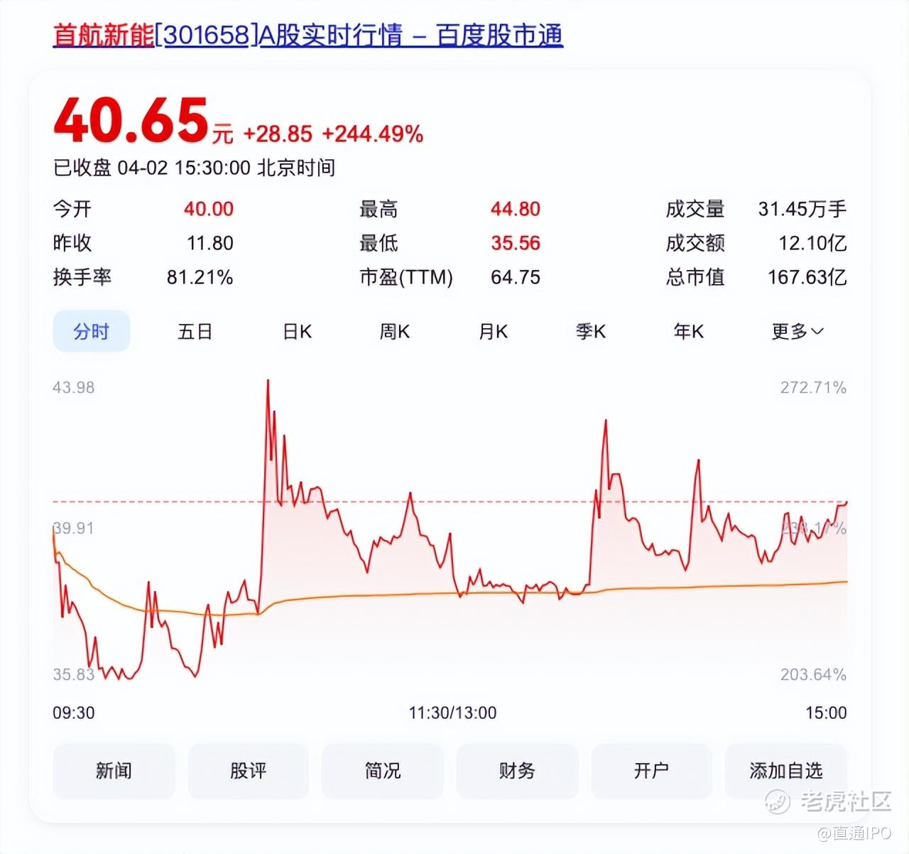 上市首日,首航新能开盘价40元/股,较11.8元/股的发行价高涨238.98%。盘中,其股价最高达44.80/股,最低报35.56/股。截至收盘,首航新能高涨244.49%报40.65元/股,总市值约167.63亿元。
