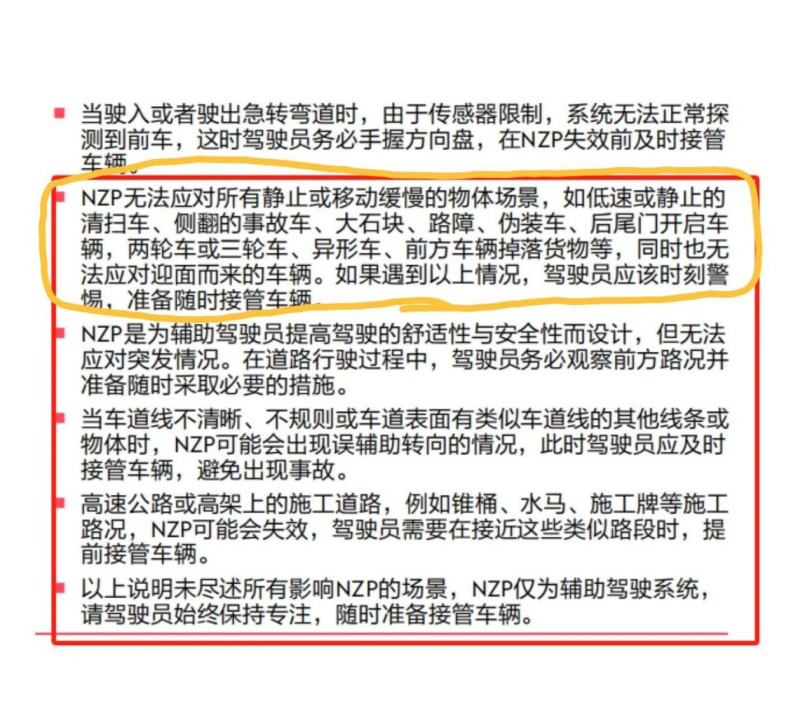 丁先生就为自己迷信“全场景”智驾付出了代价。事故后,在跟车企的拉锯战中,客服发来的解释说明显示,NZP在面对高速施工路段的锥桶、水马、施工牌等时,可能会失效,需要司机始终保持专注,随时准备接管车辆。而他平时根本没注意到NZP还有这些使用限制。