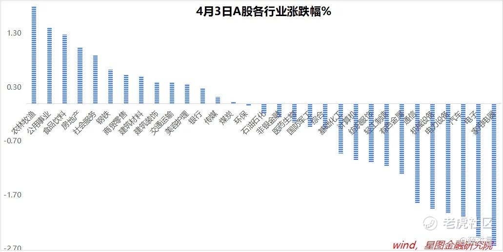 与此同时,内需对冲政策预期有所升温,纯内需板块迎来阶段性机会。从4月3日行情看,农林牧渔(1.81%)、公用事业(1.41%)、食品饮料、房地产、社会服务等板块均涨超0.8%。二级行业视角,动物保健(5.32%)、旅游及景区(2.19%)、休闲食品、酒店餐饮、养殖业、房地产服务等均涨超1.8%。