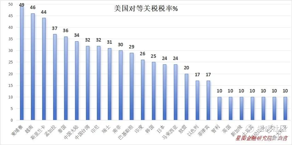 现阶段,美国“对等关税”主要包括两项行政令:一是自4月5日起,对所有贸易伙伴设立10%的“最低基准关税”,豁免半导体、能源矿物等特定商品。二是自4月9日起,对贸易逆差较大且存在非关税壁垒的国家征收更高税率,比如,中国大陆税率34%(在现有20%的基础上叠加,实际税率高达54%)、欧盟20%、日本24%、韩国25%、印度26%、中国台湾地区32%,越南更是高达46%。特朗普特别强调,这些数值是综合考量关税与非关税壁垒后"减半收取"的结果。