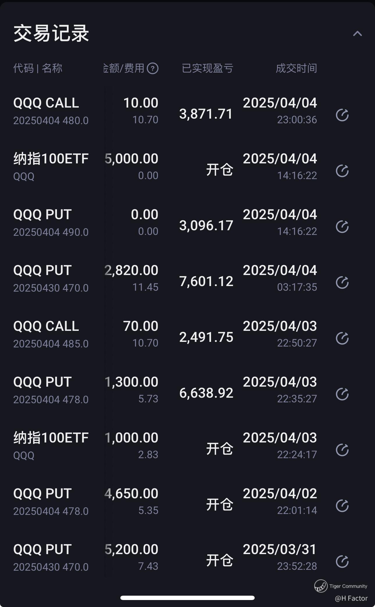 上周预言“周一周二小幅震荡,至周三宣布关税措施前,QQQ 维持在前低466附近。周三关税放鸽,周三周四大涨,周五先涨后跌或震荡下跌,QQQ收盘回落到485-480之间。” ——关税宣布临时推迟到4.2日盘后,故周四关税前的预言都算精准,这也奠定了本周丰厚利润的基础,即在周一至周三高点时买put 卖call,周四周五大跌时结盈。