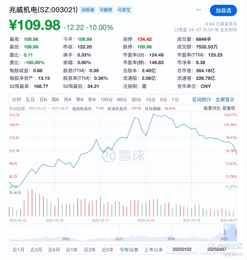 今年以来,兆威机电股价呈现“翻倍式增长”,从1月初的65元/股,最高触及165元/股。受近日大盘普跌影响,今日,兆威机电股价开盘跌停,报109.98元/股,总市值264.18亿元。