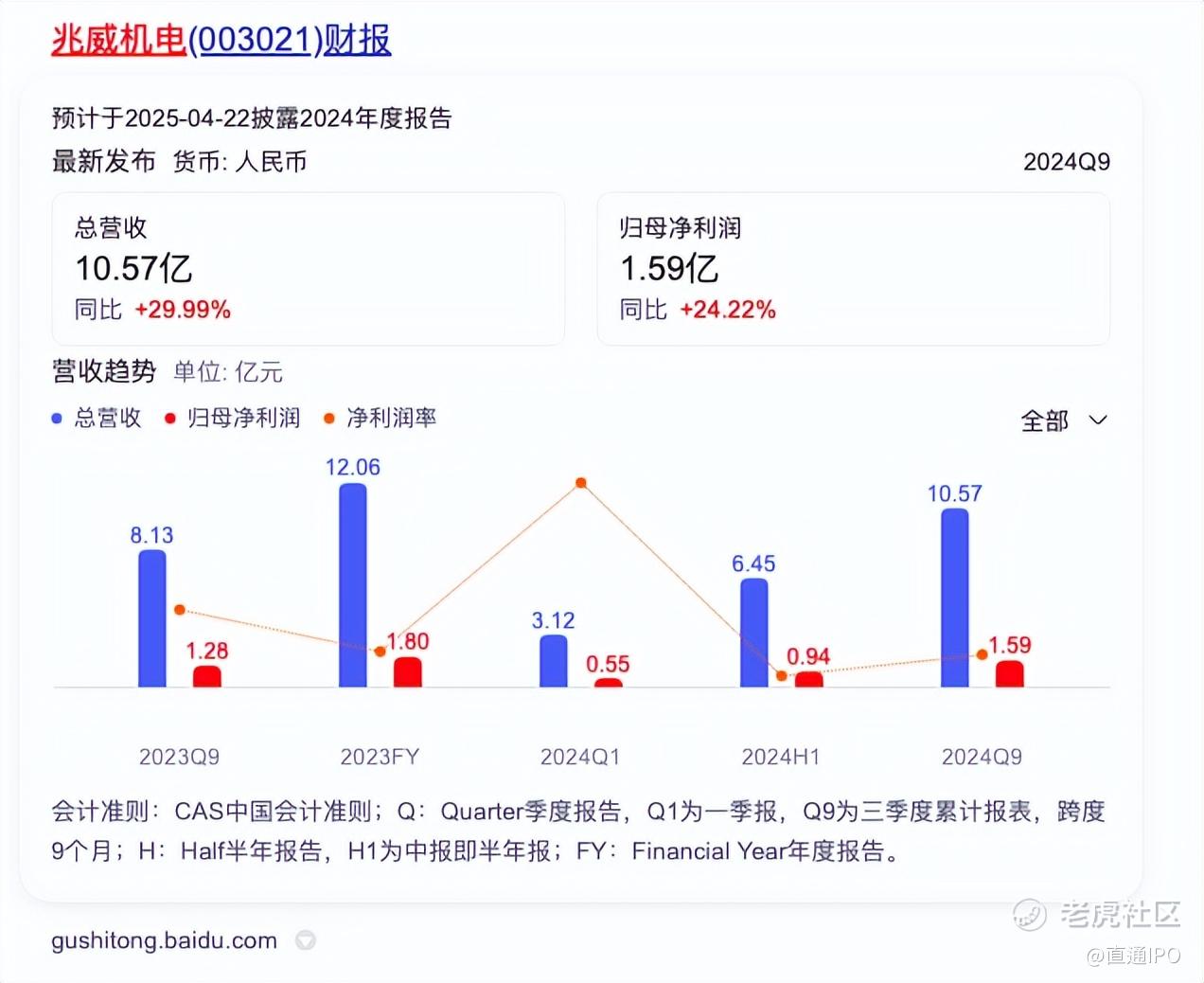 此前,兆威机电于2024年10月份发布的三季报显示,公司营业收入约10.57亿元,同比上升29.99%,归母净利润约1.59亿元,同比上升24.22%。其中,公司第三季度营业收入约4.12亿元,同比上升33.07%,第三季度归母净利润约6533.76万元,同比上升17.88%。