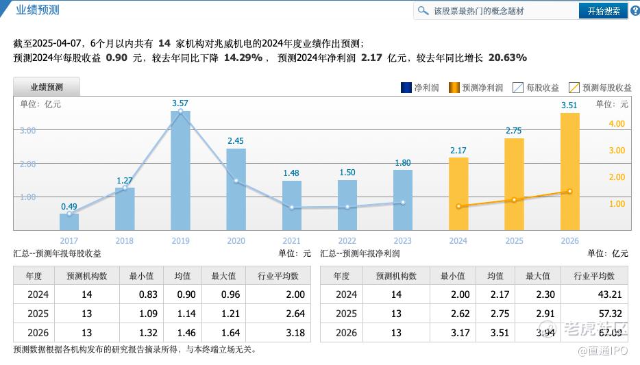 基于此,截至2025年4月7日,6个月以内共有14家机构对兆威机电的2024年度业绩作出预测:2024年净利润2.17亿元,较去年同比增长 20.63%。