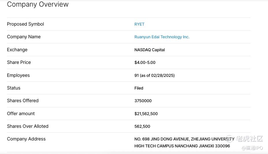 4月8日,专注于K-12教育的软件提供商——江西软云科技股份有限公司(简称:软云科技),将于纳斯达克敲锣。其发行股份数量为375万股,发行价为4-5美元,募资金额达2156.25万美元,超额配售股份数量56.25万股。
