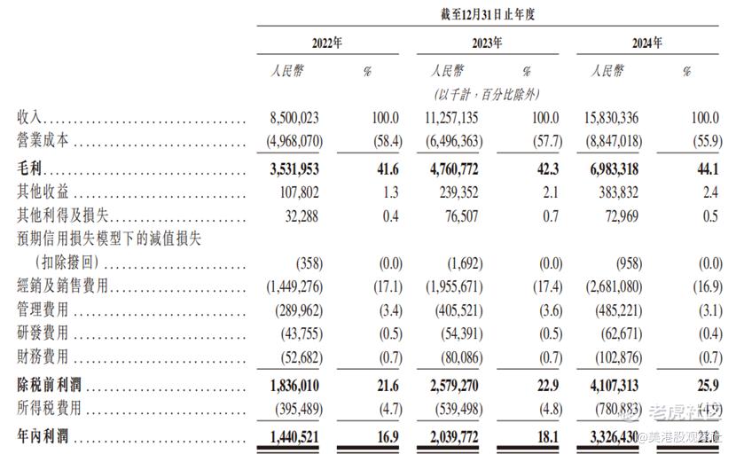 从营收数据来看,2022年至2024年,东鹏饮料的营收呈现出强劲的增长态势,分别为85亿元、112.57亿元、158.30亿元,年复合增长率高达36.47%。净利润同样表现出色,2022年净利润为14.41亿元,2023年增长至20.40亿元,2024年进一步攀升至33.26亿元,年复合增长率达到51.96%。如此高的营收和净利润增长率,反映出公司在市场拓展、产品销售以及成本控制等方面取得了显著成效。