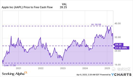 总体而言,在苹果和整个“七巨头”一半的收益来自国际市场的背景下,这种生产策略变得至关重要。最后,由于收入增长停滞,苹果不应被视为一家成长型公司。因此,如果苹果市场已经饱和,那么自由现金流倍数似乎是一个很好的估值指标。根据自由现金流倍数,该公司估值合理,因为该比率即将达到其长期(5年)移动平均线。