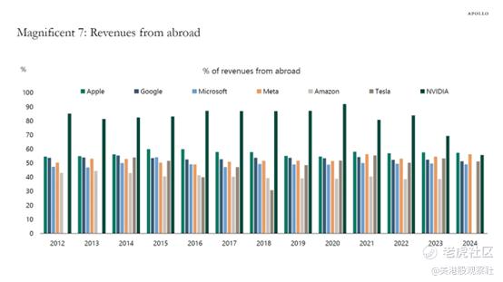 由于苹果被归类为“七巨头”之一,其约50%的收益来自海外,高于标准普尔500指数41%的平均水平。这种国际权重使苹果更容易受到全球贸易中断、汇率波动以及地区性报复措施的影响。欧洲可能实施的数字服务税(作为报复工具)可能进一步侵蚀苹果的海外盈利能力。如果实施这样的税收,将影响苹果的收入,而合规成本和监管不确定性可能使其核心市场在经济上变得不那么可行。欧洲是苹果国际市场的重大组成部分;这些风险对其收入、利润和估值的持久性具有重大影响。