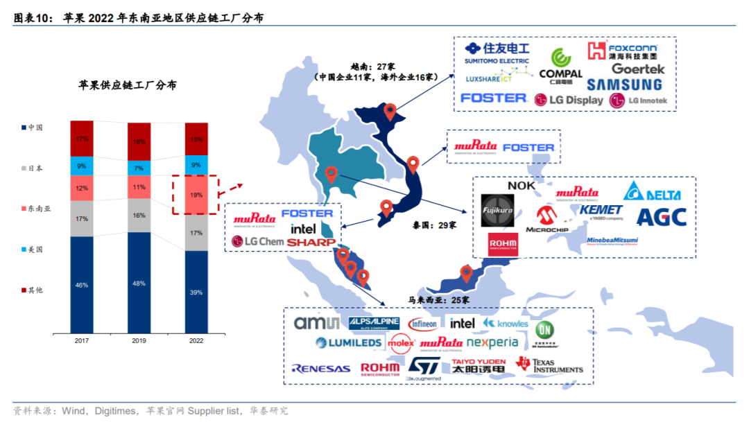 苹果的供应链曾100%依赖中国,在特朗普第一次担任美国总统后,苹果就开始降低对中国的依赖,供应商鸿海等公司纷纷在东南亚各国设厂。根据华泰证券的报告,2017年中国占苹果供应链的比重高达46%,到2022年降到了39%。与此同时,东南亚的占比从2017年的12%增加到2022年的19%。