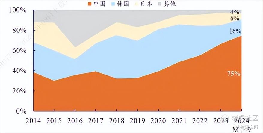 而从全球的竞争情况看,国内玩家正在逐渐侵蚀韩国、日本等传统造船强国的市场份额。2024年前三季度,我国新接订单量的全球份额已经接近75%,相较于七年前的份额已经实现了翻倍增长。