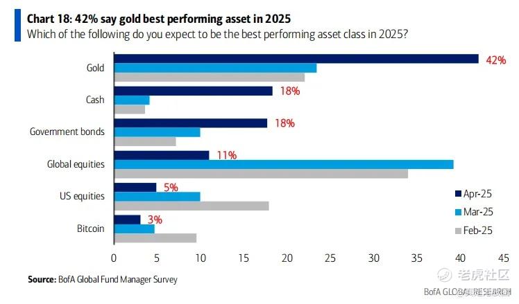 在这种情形下,有42%的人认为黄金是今年最好的交易,其次是有18%的人认为拿着现金最好,也有18%的人认为拿着国债比较好,而认为全球股票表现最好的比例收窄至11%,这应该是最近两年最低的水平了,大家对股票都很悲观。