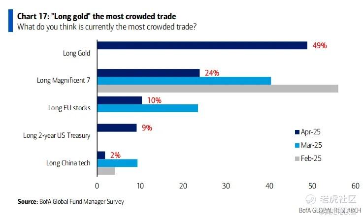 过去一年霸榜最拥挤交易的Mag 7从2月份的55%收窄至24%,虽然大家减仓很多,但还是长线资金交易的主题。其次,3月份美股震荡时,资金逃向了欧洲股市和港股,但在关税发动后,做多欧股和做多中国科技股的比例也在明显收窄,说明在全球股市大震荡下,大多数资金都涌向黄金找避险。