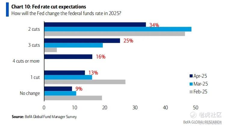 在关税冲击经济的影响下,有34%的人认为今年降息2次,在上个月时认为降息两次的比例是接近一半;而有25%的人认为降息3次。