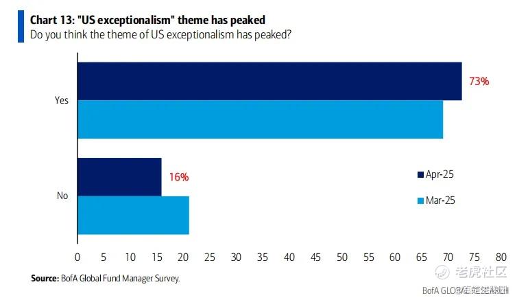 在美股这次大跌后,“美国例外论”=“只买美股,其他不买”的看法达到73%。