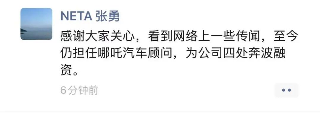 有传闻称哪咤汽车原CEO张勇已于离职前办理英国签证,目前身在英国。对此,张勇在朋友圈回应称:“感谢大家关心,看到网络上一些传闻,至今仍担任哪咤汽车顾问,为公司四处奔波融资。”