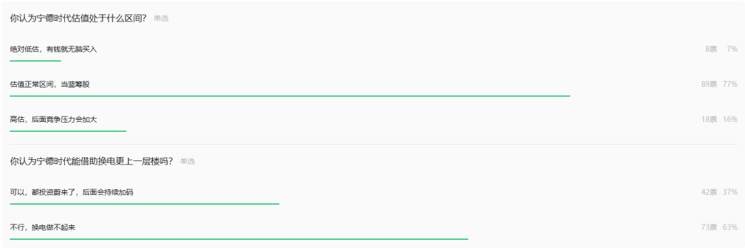 问题有两个,第一个是看看大家对宁德估值的预期,从投票结果来看,目前绝大部分人都认为宁德的估值处于合理区间,可以把它当做蓝筹股看待。