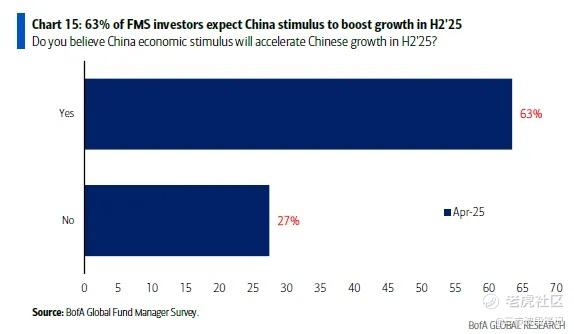 其中63%的FMS投资者预期中国的刺激措施将在2025年下半年提振增长。