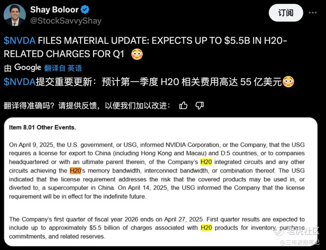 美国商务部,昨日通知英伟达,从本周一开始,向中国出口H20芯片需申请无限期有效的出口许可。在得到这一消息后,英伟达宣布计划在第一财季,计提55亿美元的费用,涉及库存、采购承诺、以及储备相关损失。