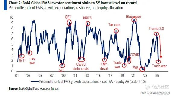 首先核心结论是:这是过去25年中情绪第5悲观的调查结果,且为过去20年来第4高的衰退预期比例,全球基金经理在宏观方面处于极度悲观状态,但市场层面尚未达到极致悲观(历史恐慌峰值的现金水平约为6%,当前为4.8%)