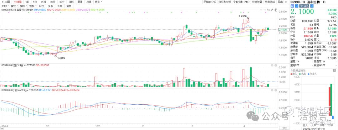 截至2025年4月16日收盘,嘉和生物-B(6998.HK)股价报2.10港元,总市值约为10.9亿港元,全天成交金额不足百万港币。
