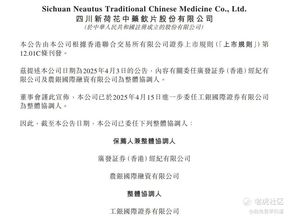 4月17日,港交所文件显示,四川新荷花中药饮片股份有限公司进一步委任工银国际证券有限公司为整体协调人。据此,截至公告日期,新荷花已委任广发证券(香港)、农银国际、工银国际为整体协调人。