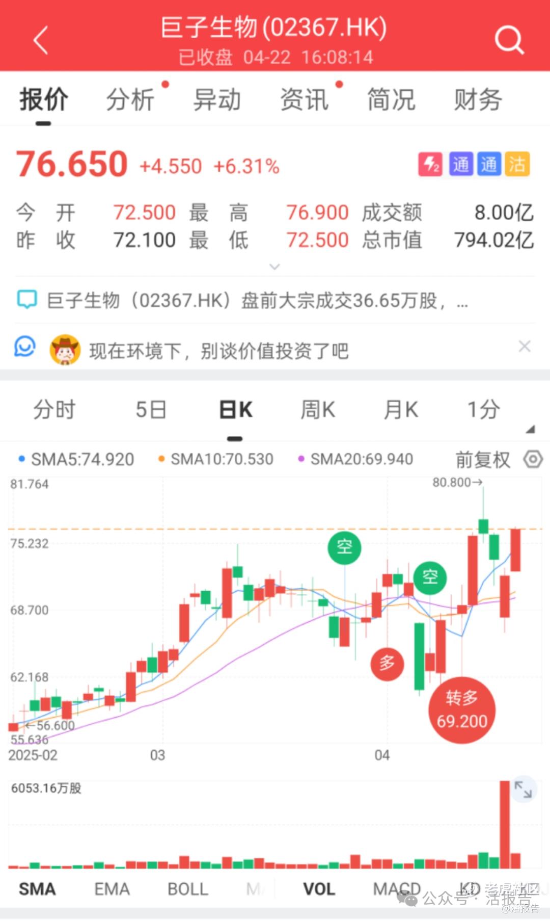据LiveReport大数据,截至4月22日收盘,巨子生物股价报76.65港元,较配售公布日的开盘价68港元,上涨12.72%;较本次配售价溢价15%,最新总市值约为794.02亿港元。