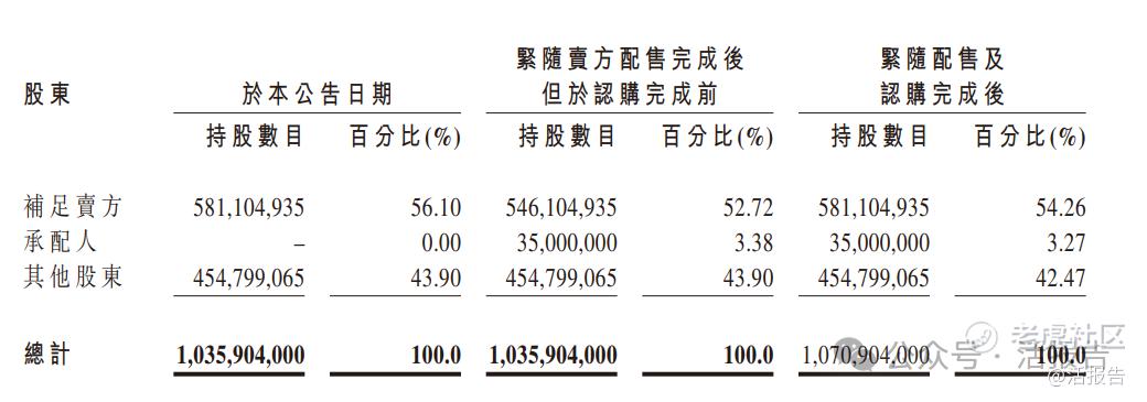 据配售及认购协议,本次旧股的出售主要来自于控股股东、联合创始人、前任执行董事范代娣博士,其通过FY Family Trust间接拥有581,104,935股股份的权益,约占配售前总股本的56.1%。