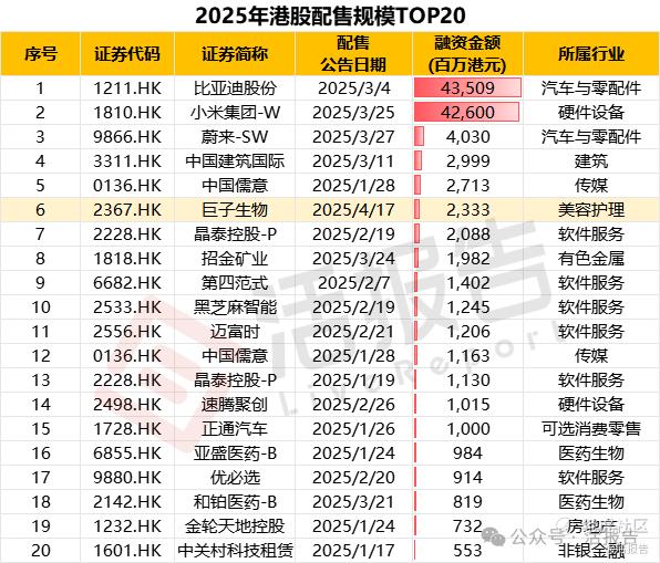 据LiveReport大数据统计,今年以来配售规模前五的公司分别为比亚迪股份、小米集团、蔚来-SW、中国建筑国际及中国儒意,融资金额分别为435.09亿、426.0亿、40.3亿、29.99亿及27.13亿港元,巨子生物则以23.33亿港元,位列第六。