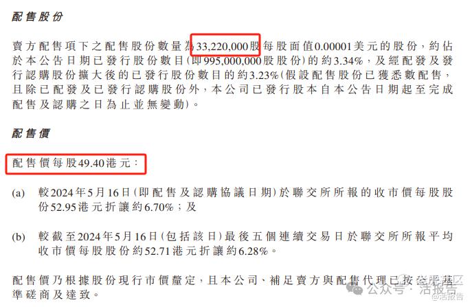据协议,范代娣博士已同意出售所持有的3500万股股份,每股配售价66.65港元,较4月16日收市价每股股份73.65港元折让约9.50%。配售及认购所得款项总额预期合共约为23.33亿港元,而配售及认购所得款项净额(经扣除佣金及估计开支后)预期合共约为22.94亿港元。