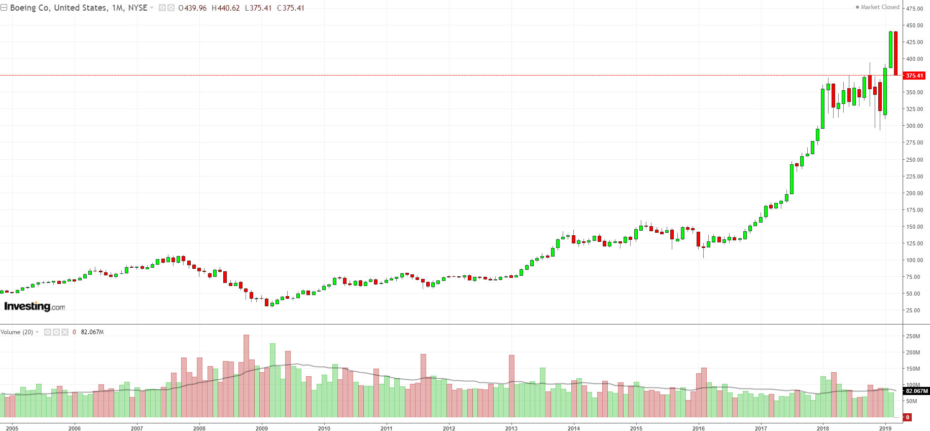 自周一美国市场开盘以来,波音公司股票便一直受到波动率的冲击。该股周一开盘报371美元,比周五收盘价422美元低12%。到周一交易结束,波音大跌7.8%,收于400美元。周二,该股再次出现大幅波动,下挫6%至375.41美元。这轮下滑会否是更深层次暴跌的开始?