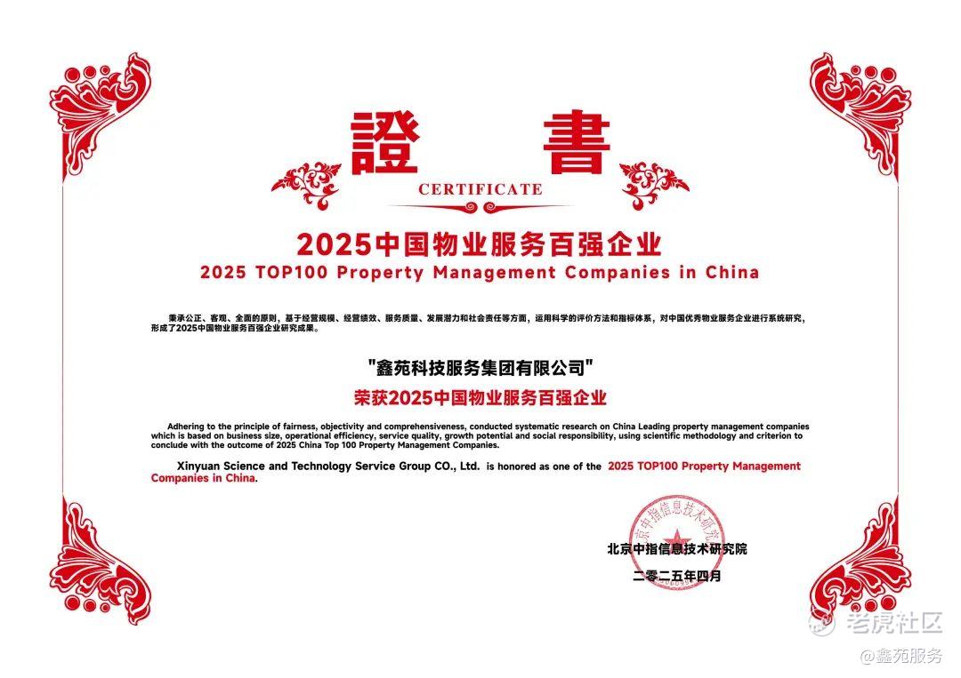 2025年4月18日,由北京中指信息技术研究院主办,北京中指信息技术研究院中国房地产TOP10研究组、中国物业服务指数系统承办的“2025中国物业服务百强企业研究成果发布会暨第十八届中国物业服务百强企业家论坛”在雄安召开。鑫苑服务凭借卓越的服务力及综合实力赢得行业认可,荣膺“2025中国物业服务百强企业”奖项。