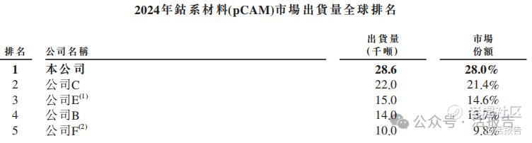 根据弗若斯特沙利文报告,在钴系材料(pCAM)市场,公司于2020年至2024年连续五年以出货量计排名全球第一,于2024年的市场份额为28.0%。全球钴系材料(pCAM)市场集中,以2024年的出货量计算,全球前五大制造商占总市场份额的87.5%。