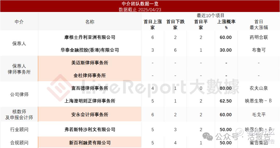 据LiveReport大数据统计,中伟股份中介团队共计9家,其中保荐人2家,近10家保荐项目数据表现参差不齐;公司律师共计2家,综合项目数据积极。整体而言中介团队历史数据表现可圈可点。