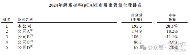 根据弗若斯特沙利文报告,在镍系材料(pCAM)市场,公司于2020年至2024年连续五年以出货量计排名全球第一,于2024年的市场份额为20.3%。全球镍系材料(pCAM)市场集中,以2024年的出货量计算,全球前五大制造商占总市场份额的65.6%。