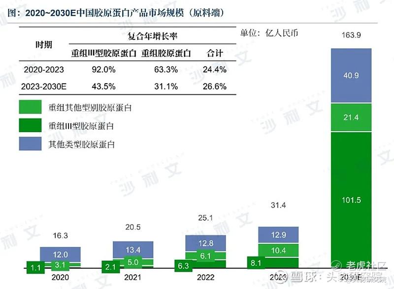 根据弗若斯特沙利文数据分析,2020-2023年,中国胶原蛋白原料端市场规模从16.3亿元人民币增至31.4亿元人民币,CAGR高达24.4%;预计到2030年,中国胶原蛋白零售端市场规模将达到163.9亿元人民币。