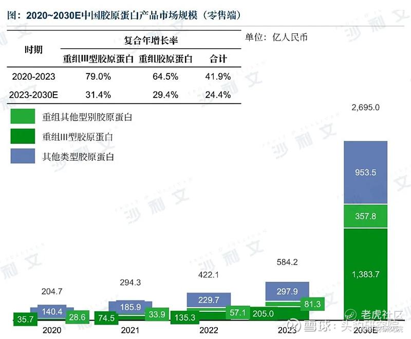 根据弗若斯特沙利文数据分析,2020-2023年,中国胶原蛋白零售端市场规模从204.7亿元增至584.2亿元人民币,CAGR高达41.9%;预计到2030年,中国胶原蛋白零售端市场规模将达到2,695.0亿元人民币。