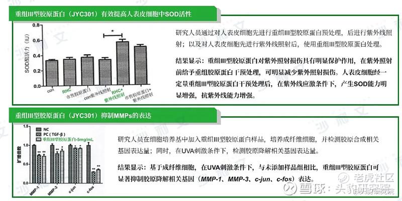 重组III型胶原蛋白抑制基质金属蛋白酶(MMPs)降解真皮细胞外基质(ECM):重组III型胶原蛋白可提高超氧化物歧化酶活性及活性氧自由基清除率,抑制丝裂原活化蛋白激酶 (MAPK) 信号通路的激活,降低MMP-1和MMP-3表达量,进而减少对真皮细胞外基质的降解,减少皮肤老化。