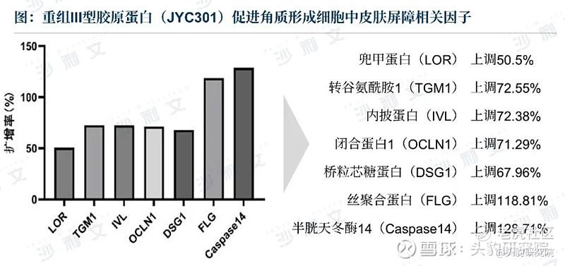 重组III型胶原蛋白再生表皮强韧屏障:重组III型胶原蛋白将角质细胞之间的排列由杂乱变得更加整齐紧密,改善角质细胞间脂质结构的结晶,提高角质层的机械性能,强化角质层屏障功能。还可上调角质形成细胞中皮肤屏障相关因子,提高表皮屏障抵抗力。