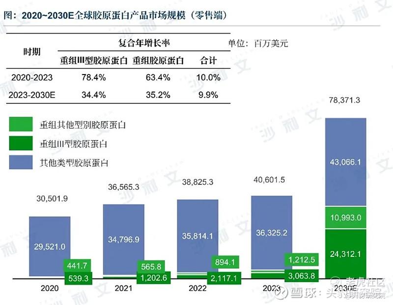 根据弗若斯特沙利文数据分析,2020-2023年,全球胶原蛋白零售端市场规模从30,501.9百万美元增至40,601.5百万美元;预计到2030年,全球胶原蛋白零售端市场规模将达到78,371.3百万美元。