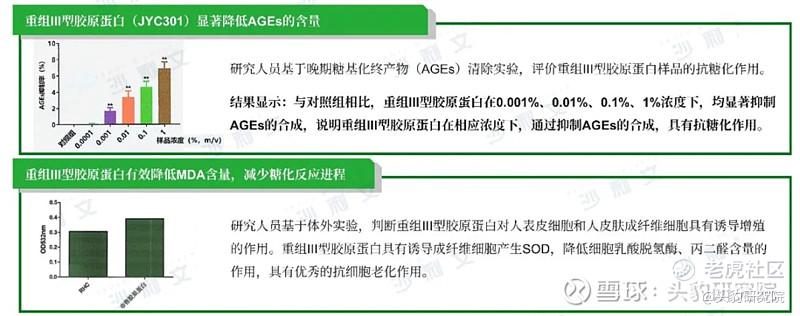 重组III型胶原蛋白抑制糖化反应破坏真皮ECM:重组III型胶原蛋白可有效降低丙二醛(MDA)的含量。MDA能够促进糖化反应的进行,而通过减少MDA的含量,可以减少糖化反应的进行;还可显著抑制晚期糖基化终产物(AGEs)的合成,减少糖化反应老化肌肤。