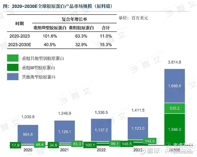 根据弗若斯特沙利文数据分析,2020-2023年,全球胶原蛋白原料端市场规模从1,030.8百万美元增至1,411.5百万美元,CAGR为11.0%。并将以15.3%的CAGR持续增长。预计到2030年,全球胶原蛋白原料端市场规模将达到3,814.8百万美元。