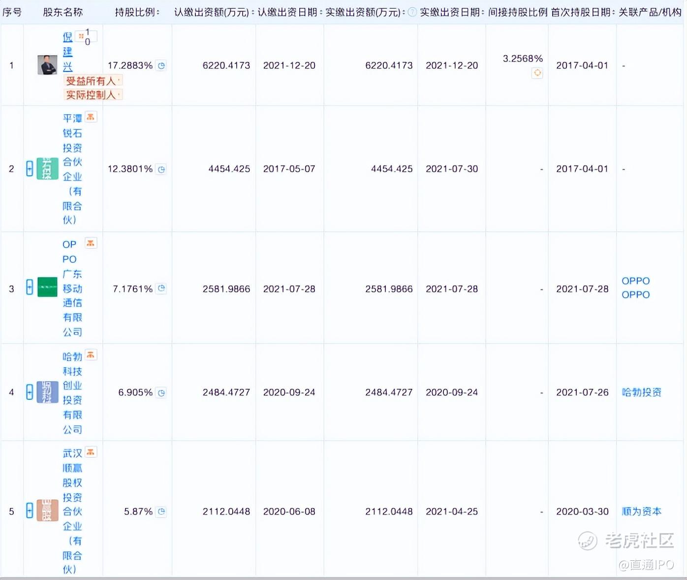 此外,OPPO持有锐石创芯7.1761%股份,系第一大外部股东;哈勃投资、顺为资本则紧随其后,分别持股6.905%、5.87%。