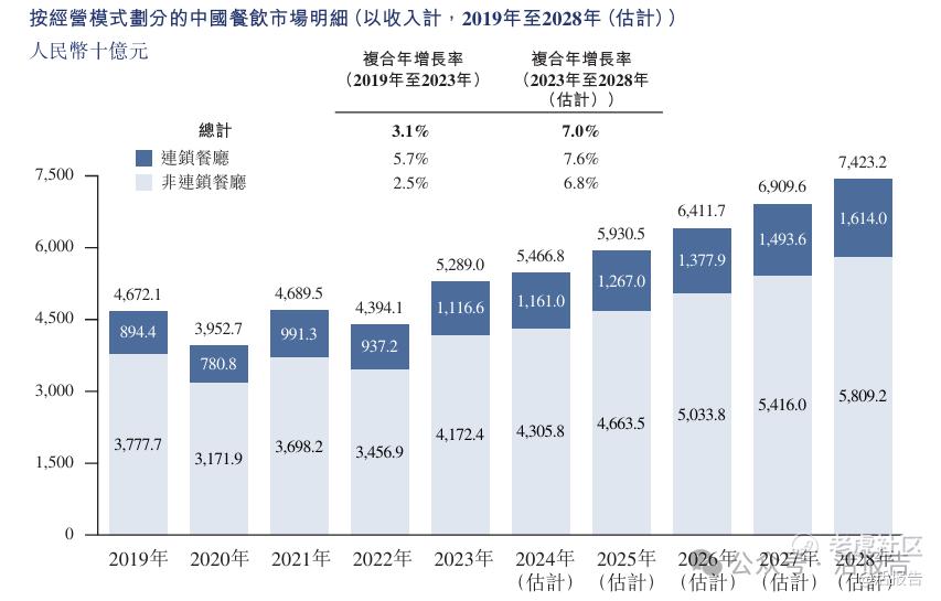 中国已成为世界上第二大餐饮市场。中国餐饮市场的总收入由2019年的人民币46,721亿元增至2023年的人民币52,890亿元,复合年增长率为3.1%。预期2023年至2028年餐饮市场的收入将按7.0%的复合年增长率增长,于2028年达人民币74,232亿元。